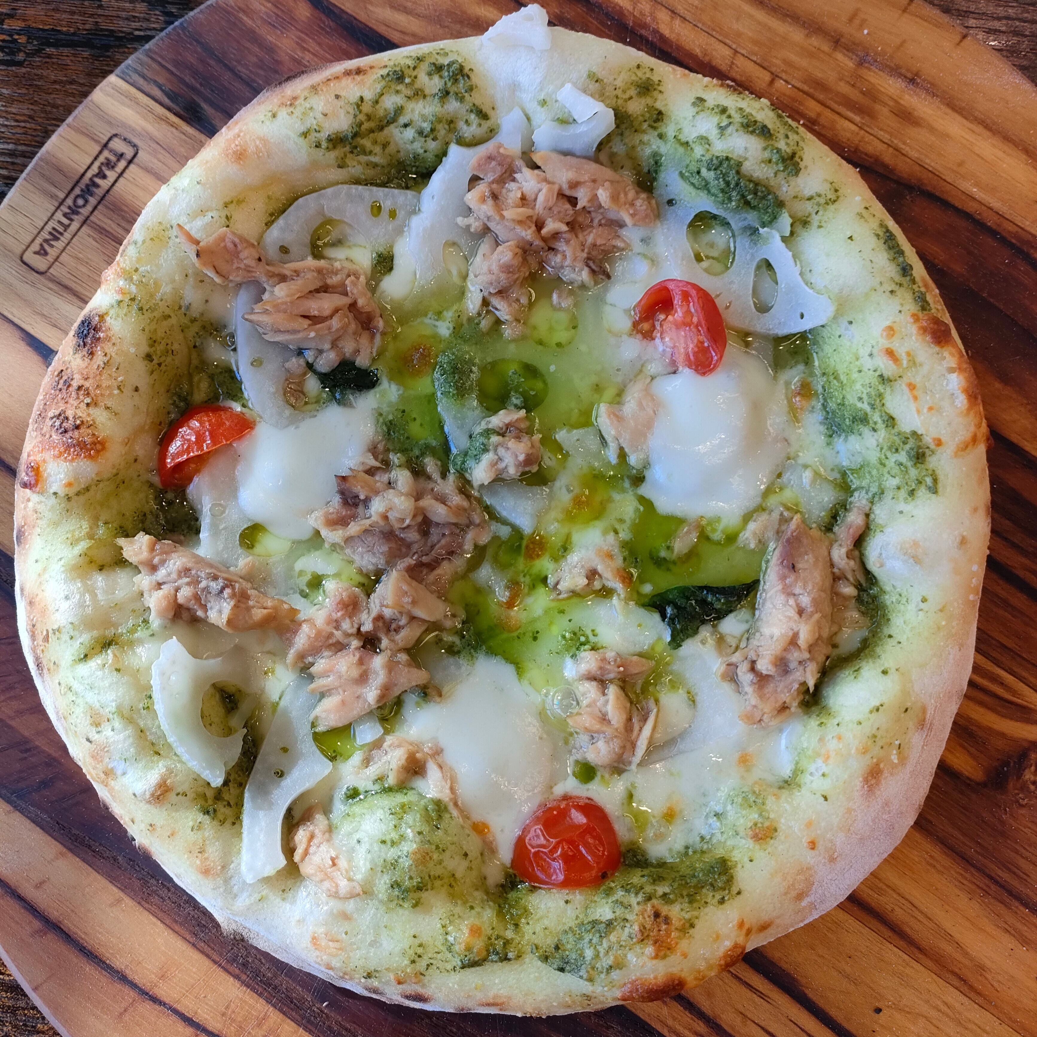 ツナと相性抜群のバジルソースにチーズと蓮根を散りばめました。